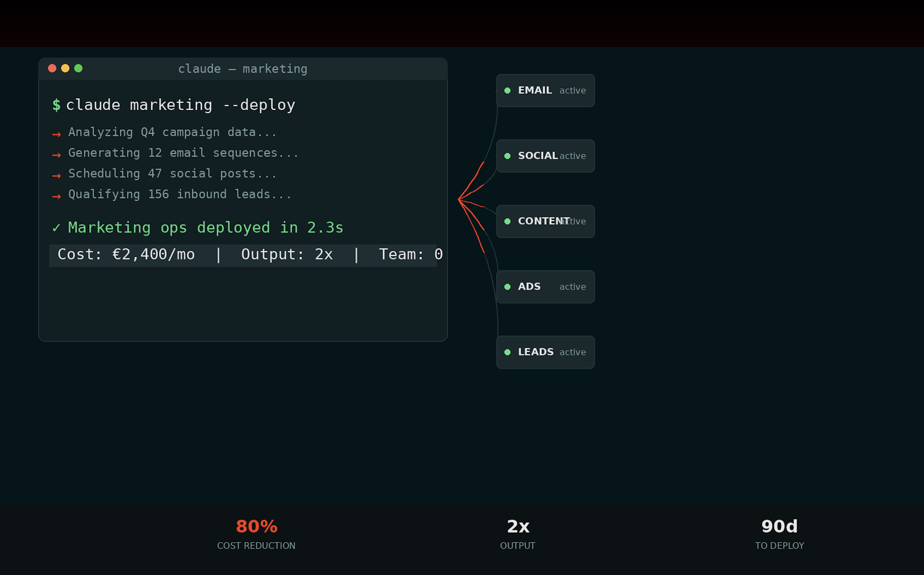 This isn't a story about replacing people. It's about building something that traditional marketing structures can't match: an AI-native marketing operation that runs from a terminal.